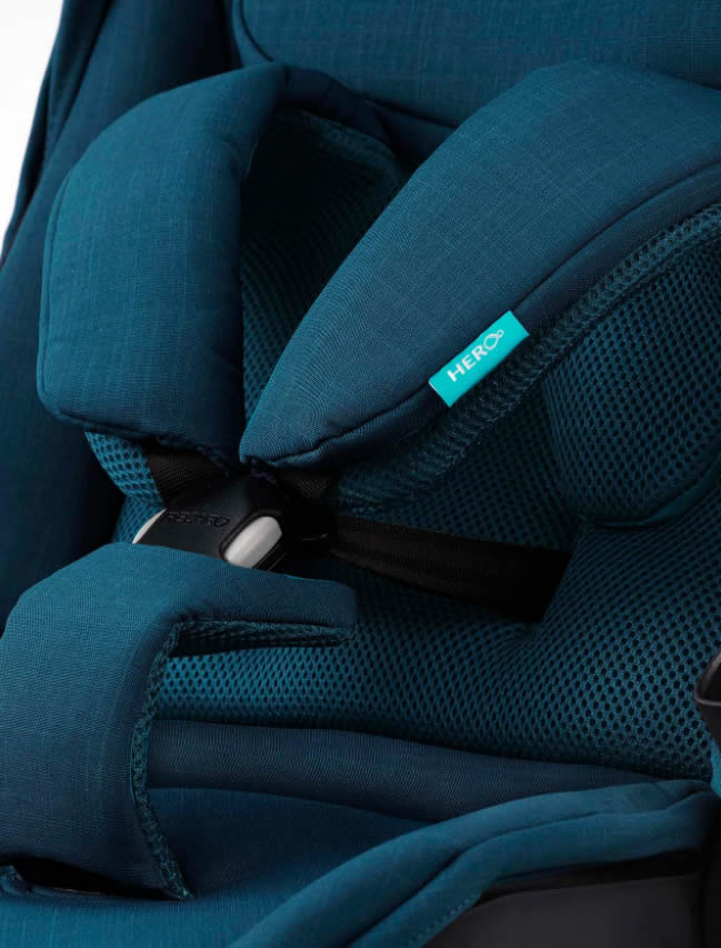 Dar confortul nu este nimic fără siguranță. Așadar, unitatea de scaun are sistemul de siguranță HERO patentat: o singură unitate care cuprinde perne de umăr, curele de umăr și tetiera previne răsucirea și alunecarea hamului.