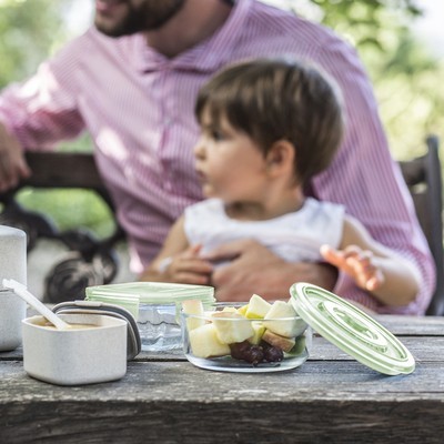 Un set cu geantă izoterma și 2 recipiente din sticlă in forma pătrată, etanșe cu capacitate de 160 ml. Alimente delicate în recipiente mici de sticlă.