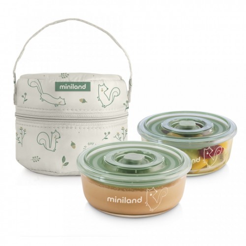 - Acest set ecologic este compus dintr-o gentuta izoterma si 2 recipiente de sticla de 200 ml, un material rezistent si durabil, care este complet transparent, permitand vizualizarea perfecta a continutului. Containerele au marimea ideala pentru a stoca separat mici portii de mancare gatita la domiciliu, lapte praf, fructe … si a le lua oriunde.